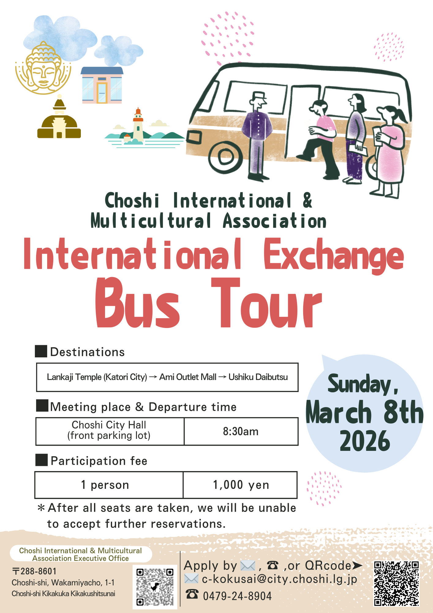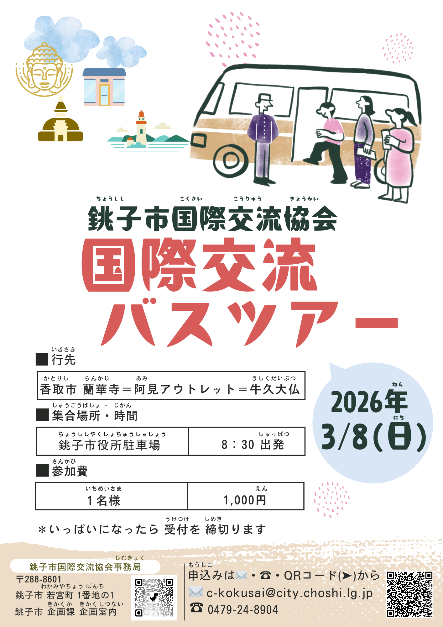 3月8日(日)の国際交流(こくさいこうりゅう)バスツアーに参加(さんか)しませんか?香取市・蘭華寺(かとりし・らんかじ)、あみプレミアム・アウトレット、牛久大仏(うしくだいぶつ)に、バスでいきます。