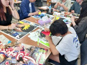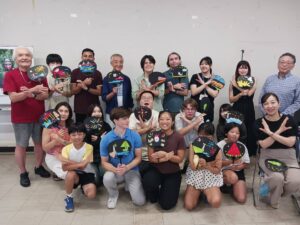 デザインや夏の思い出について話すなど会話も次第に増え、和気あいあいと作業に打ち込んでいました。出来上がった団扇は、交流会の記念に持ち帰っていただきました。一部は銚子市の姉妹都市アメリカ合衆国オレゴン州のクースベイ市に寄贈いたします。彼の地の皆様へ、銚子の夏の思い出のお裾分けとさせていただきます。