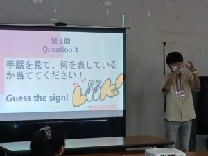 した様子で相談しながら回答し、正解すると歓喜の声をあげていました。クイズから1つご紹介します。「左手は胸の前で水平に、右手で人差し指と親指で輪を作って左手の下から上に動かす」と何の意味でしょう?ヒントは毎年元旦に見られる銚子のアレです。是非調べてみてください。最後は手話で歌を歌うコーナーもあり、手話の動作と一緒に大合唱となりました。