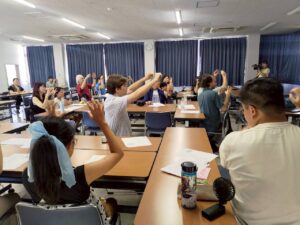 今回の交流では2つのワークショップを行いました。まず、一つめは日本の手話体験です。千葉科学大学の看護学部准教授の大塚先生と手話サークルの学生3名に登壇していただきました。アルファベット26文字と五十音の比較や今年開催されるデフリンピックについてなど多くのお話を伺いました。母国で手話を学んだことがあるというALTの方もいらっしゃいましたが、言語によって手の動きが違う事を知って、新鮮な知る喜びを得られたようでした。