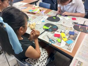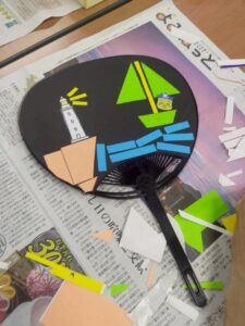 2つめのワークショップは、講師に銚子出身の末木さんをお迎えしました。絵画造形教室で子どもたちに教えている経験豊富な方です。黒い団扇に色画用紙などを使い、銚子を表現しました。黒地を夜空に見立てていくつもの色を貼り付けていくと、銚子の打ち上げ花火ができあがります。その他銚子電鉄、大橋、金目鯛、キャベツ、スイカ、メロン…などなど多くのアイデアを描いてもらいました。集中するあまりつい会話が無くなってしまう場面もありましたが、お互いの